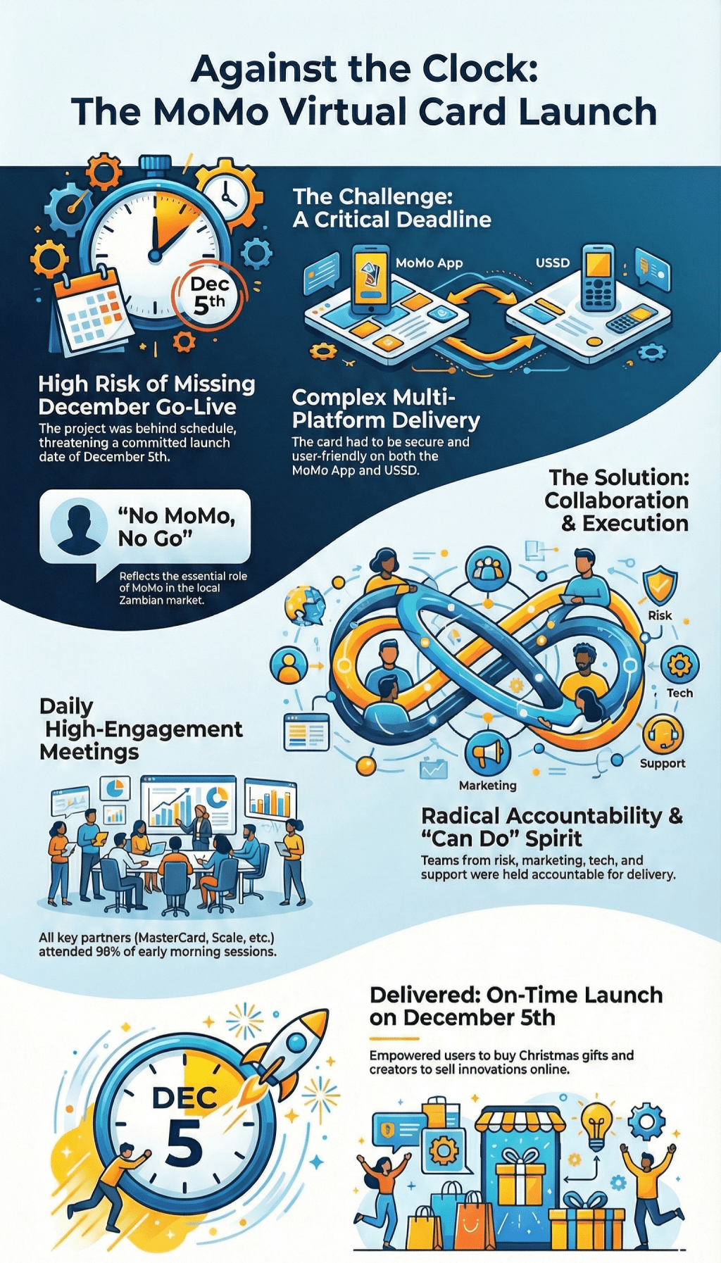 It was with a great, unique team (MoMo Zambia, MasterCard, Scale, Network International) that we successfully sealed the project when the tide was high. Thoughtful leadership, accountability, and a “Can Do” spirit brought us together as One MoMo. Our goal was clear: to ensure John could buy Christmas gifts for his family from Europe without the hassle of Visa, and to impact the African market by empowering creators to sell their innovations online.